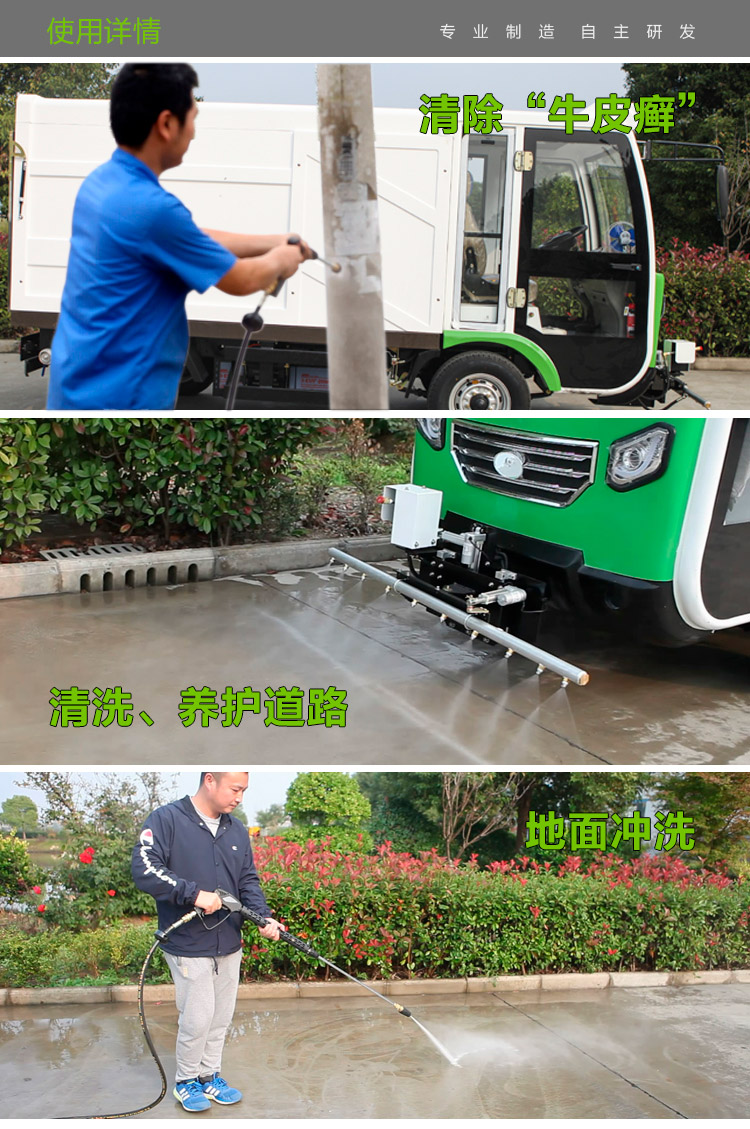 四轮路面养护MN-H51配备喷水枪,主要用于清除城市中“牛皮癣”、小广告、道板、护栏、路崖的死角等部位和路边摊地面油污,也可用于消毒和喷洒农药。